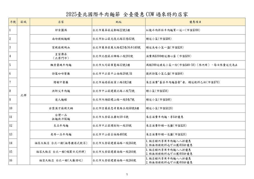 為帶動「2025臺北國際牛肉麵節」整體推廣效益,今年更與「Gomaji」平台合作,推出限量「臺北牛肉麵放大券」,消費者僅需168元,即可獲得面額200元的折抵券,於臺北市32間得獎及特色牛肉麵店家使用,使用期間為114年7月14日至8月31日,一券在手、牛麵盡享,讓經典美味再升級。
